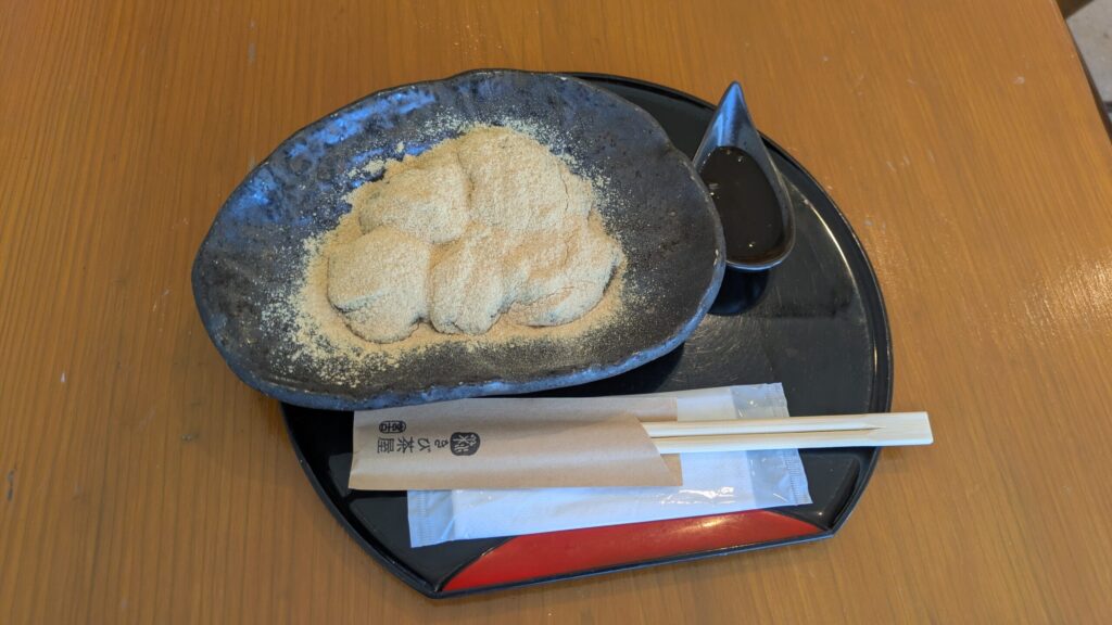 とろとろもちもちしたわらびもちで、きなこ・黒蜜と一緒に食べるとおいしかったです。